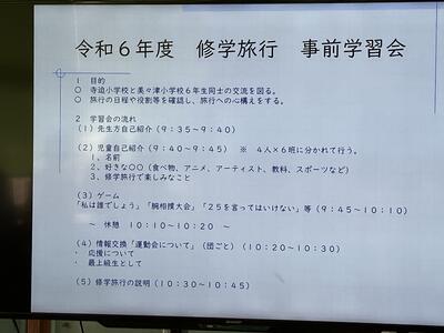宿泊学習まであと3週間余りとなりました。そこで、今回は、宿泊学習に向けての心構えや、保健面で気を付けることなどについて学習しました。何より、5年生同士で顔合わせができてよかったです。宿泊学習を通して、さらに美々津小学校と寺迫小学校の児童同士の仲が深まることを願っています。