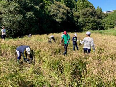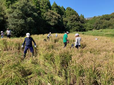 田んぼに入り、子どもたちが稲刈りを始めました。今回は、コンバインで収穫できない場所を中心に稲刈りをしました。はじめは、恐る恐る稲を刈っていた子どもたちも、慣れてくるとさくさくと刈り取っていました。家でお手伝いの経験がある子は、慣れた手つきでどんどんと刈り取っていました。