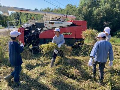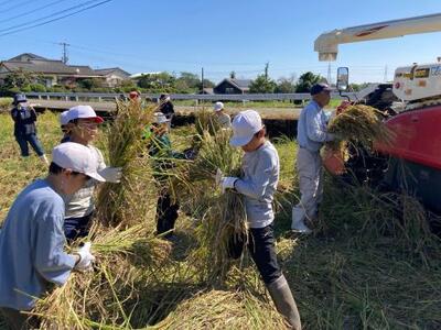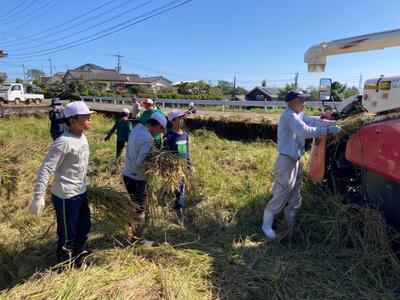 稲刈りの体験が終わった後は、刈り取った稲をコンバインまで運び、脱穀してもらいました。昔は、脱穀するのも一苦労だったと聞いていますが、コンバインはあっという間に脱穀します。機械の力はすごいと改めて思いました。脱穀もみんなで協力したので、あっという間に終わりました。