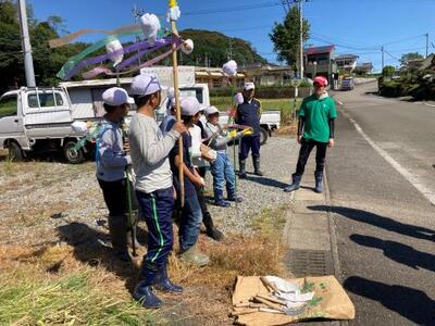 力を合わせた案山子づくりから設置をして学校に帰って来るまで、