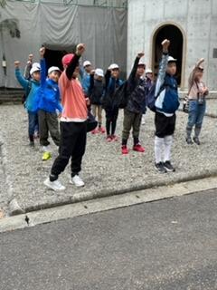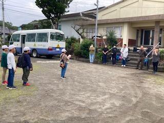 出発式では、代表の児童が「今日は、ぼくたちが楽しみにしていたむかばき宿泊学習です。規律・協同・友愛・奉仕を全部守れるように頑張ります。美々津小の友達と仲良くできるように頑張ります。それでは、元気よく行ってきます。」と保護者の方に元気よく発表していました。