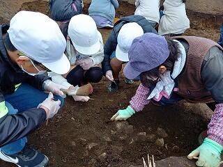 初めて発掘現場を目にする子どもたちは生き生きとしていました。なんと、見学だけかと思っていましたが、発掘作業も体験させていただきました!
