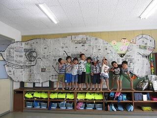 今年度より教科書が変わり、「くじらぐも」という教材文を今勉強しています。担任の先生に聞くと、どのくらい大きなくじらくもなのか作ってみよう!ということで、学校に毎日届く新聞紙で作ったとのこと・・・。