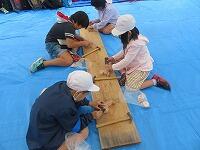 主な活動は、木工制作と秋の自然を感じながらのゲームをしました。木工制作では、不慣れな金づちを使いながら、「こいぬ」や「バッタ」を作り上げていました。秋の自然を感じながらのゲームでは、紅葉した木々の中を走り回りながら秋を満喫することができました。