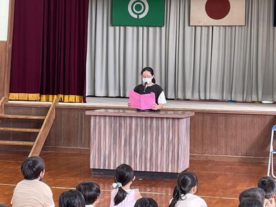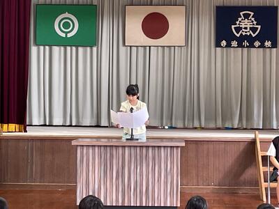 1校時に、始業式が行われました。始めに6年生・3年生の代表児童が作文発表を行いました。