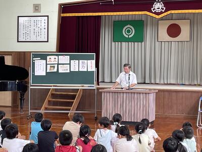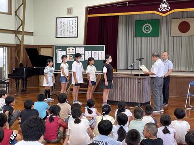 その後、校長先生のお話がありました。校長先生からは「めざす児童像」の3つを目指して2学期も頑張ってほしいという話がありました。