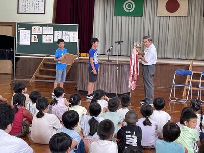 最後に、表彰が行われました。西日本大会でソフトボールのスポーツ少年団が準優勝に輝き、また市の牧水かるた大会のチーム対抗戦で寺迫小学校が2位という、どちらもすばらしい成績を残しました!おめでとうございます!