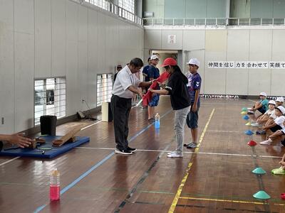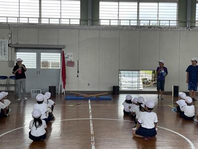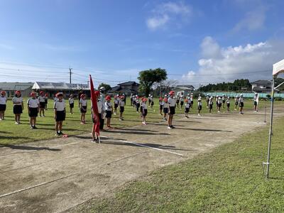 今回は、入場・開会式・退場・閉会式の練習です。昨年までは実施できていなかった入場行進を今年度は行います。始めに6年生のお手本を見てから、いざ練習です。「いち!に! いち!に!」のかけ声に合わせて、元気いっぱい上手に行進ができていました。