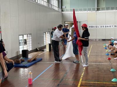 校長先生より赤団・白団それぞれの団長へ団旗の授与が行われました。