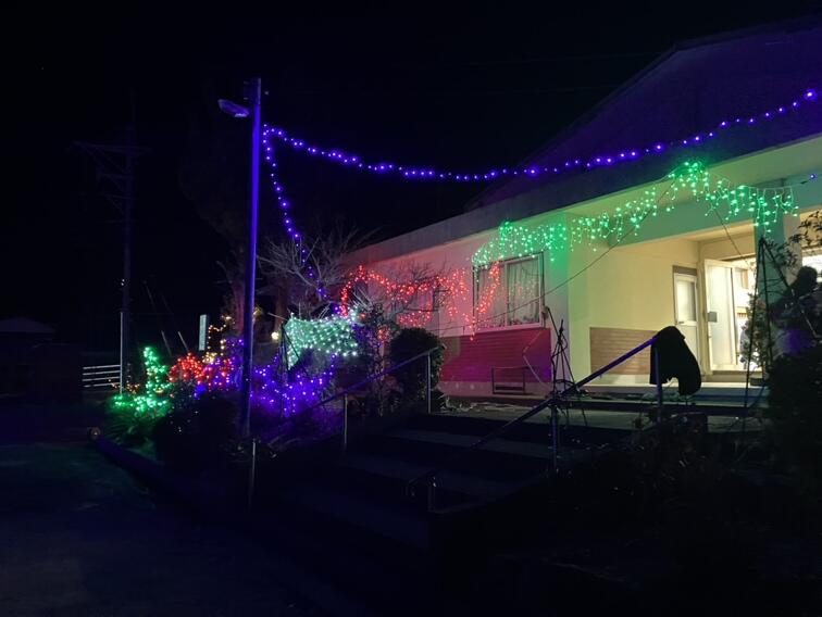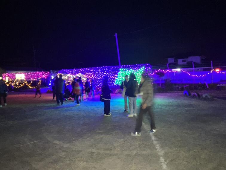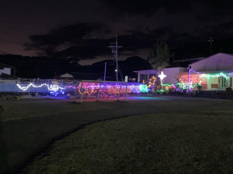 寺迫小学校の4区公民館(高松区、宮ノ下区、落鹿区、寺迫区)が、公民館の垣根を越え、4区の住民が連携して学校のグラウンドにイルミネーションをともしてくださいました。