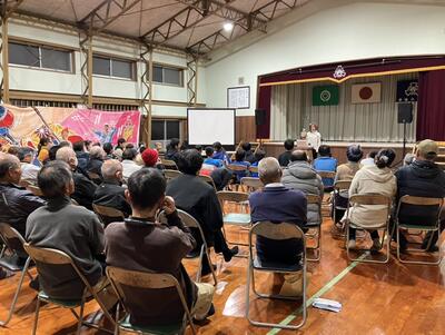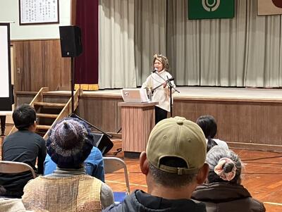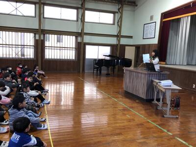 第1部の常盤様の講話では、戦時中に沖縄からこの寺迫の地域に疎開することになった子ども達の交流の様子、そして戦後何年も経った再会の様子などを、戦時中の厳しい生活の様子と絡めながらお話しいただきました。常盤様には、11月にも6年生の社会科の授業の外部講師として来ていただいています。