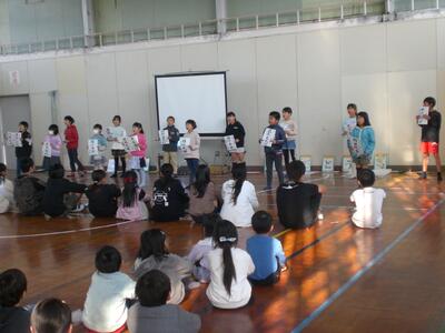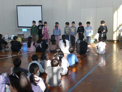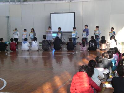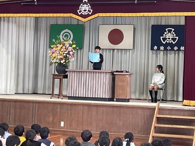 その後、3年生と1年生の代表児童の作文発表がありました。「1年間を振り返って勉強やお手伝いを頑張ったこと」「1年生で長縄や縄跳びを頑張って思い出ができたこと、漢字・計算を頑張ったこと」2人とも、この1年間での頑張りを上手に発表してくれました。