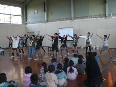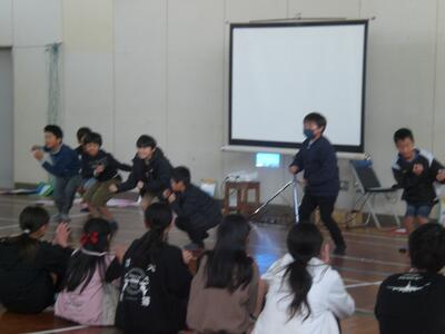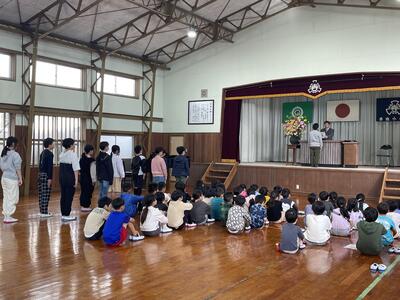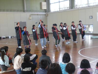 始めに、体育館に集合して全校でのお別れ集会でした。まず、在校生から6年生へ向けて卒業のお祝いと感謝の気持ちを込めて発表を行いました。どの学年も今までのありがとうの気持ちを歌や言葉、ダンス、エールにのせて6年生へ届けていました。在校生の後は6年生からお礼の気持ちを込めての歌と合奏、エールの発表が行われました。卒業に向けて、お互いにありがとうの気持ちを伝え合い、とても温かな気持ちになるお別れ集会となりました。