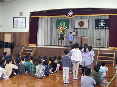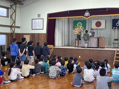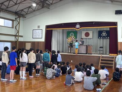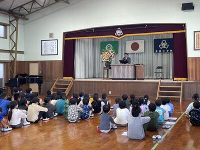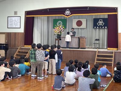 校長先生のお話では、それぞれの学年の1年間を振り返りながら各学年の頑張りについてお話がありました。入学式から大きく成長したこと、かけ算を頑張ったこと、ひまわりフェスティバルでの素敵な発表、米作りや上学年としての頑張りなど、この1年間本当に良く頑張りました。1年間を振り返り、これからさらに頑張りたい事や反省を活かして新しい学年に向けて前に進んでほしいと伝えられました。