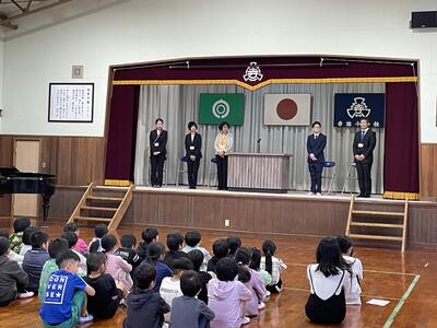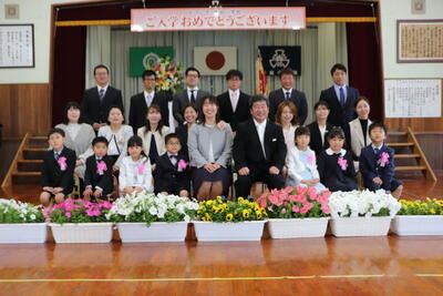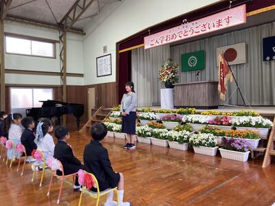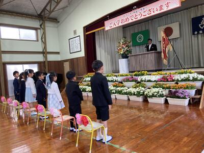 4月12日(金)、令和6年度入学式が行われました。今年度から全校児童が参加しての入学式となり、入場では2~6年生の「さんぽ」の歌声の中、ドキドキ・ワクワクの表情で7名の1年生が入場しました。式の中では歓迎のあいさつとして6年生が中心となり、1年生へ全校児童で歓迎の気持ちを伝えました。