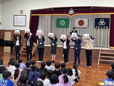 始めに新任式では5名の新しい先生方が寺迫小学校に赴任されました。子ども達は先生方の挨拶を目を輝かせながら聞いていました。短歌朗詠や歓迎の挨拶で先生方を温かく迎えることができました。