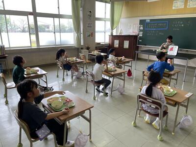 給食時間の様子を見に行くと、みんな上手に美味しそうに食べていました。片付けの仕方も6年生に教えてもらいながら、ばっちりできています。毎日楽しく沢山の事を学び、どんどん成長していく1年生です。