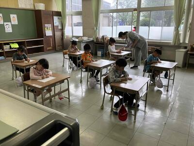 1年生が入学して1週間が経とうとしています。1年生教室からは、学校での過ごし方や算数、国語など先生と一緒に一生懸命楽しく学ぶ声が聞こえてきます。火曜日の朝は「ぐんぐんタイム」でしたが、1年生は何してるのかなと思って行ってみると、1年生なりになぞり書きの練習に集中して取り組んでいました。
