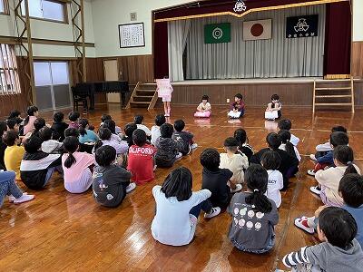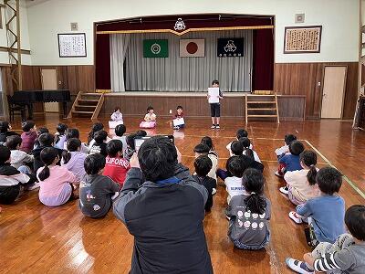 本校では日向の偉人、若山牧水にちなんで「牧水タイム」という短歌作成の時間を設け、つくった短歌を全校児童の前で発表する機会として短歌発表集会を設定しています。