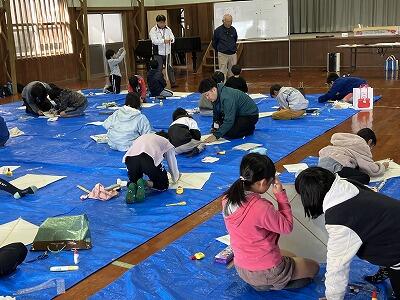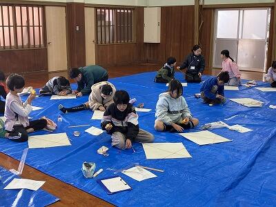 寺迫小学校では、3・4年生が凧作りに挑戦しました。細かな作業もあって上手にできるかなと心配でしたが、講師の先生方の教えをよく聞いて凧作りに取り組んだので、みんな上手に凧を作ることができました。