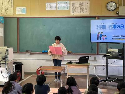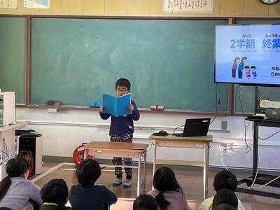 1年生は、漢字の書き順を覚えるのが難しかったけどドリルや漢字ノートを使って頑張って覚えたこと、運動会の全校リレーで一生懸命がんばってみんなが応援してくれたことが嬉しかったこと。そして、かっこいい2年生になれるように3学期は忘れ物に気を付けて頑張ると発表してくれました。