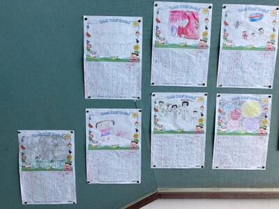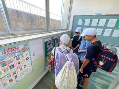 2階へ上がる階段の掲示板には、1年生の夏休みの思い出の日記が掲示されています。夏休みに様々な場所におうちの人と一緒に出かけ、楽しい思い出がたくさんできたようです。絵からも、楽しい様子がよく分かります。