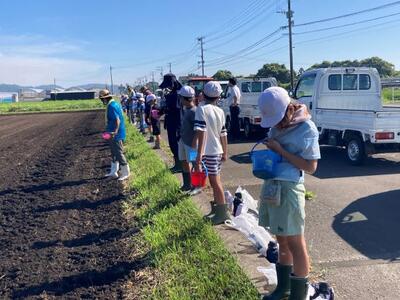 9月8日(月)、今年度も1・2年生がコスモスの種まきに出かけました。種をまく場所は、国道10号沿いの畑です。30分くらい歩いてようやく目的地に到着。この日もとても暑かったですが、1・2年生はとても頑張って歩きました。
