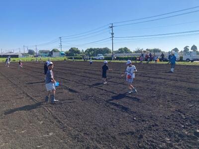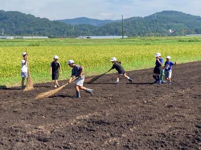 種まきの仕方について説明を聞いた後、さっそく種まき開始!小さなバケツに入ったコスモスの種を、畑の隅々までしっかりとまきました。その後、まいた種がさらに一面に広がるように、ほうきではきました。きっと11月には畑一面にコスモスの花が咲くことでしょう。