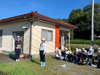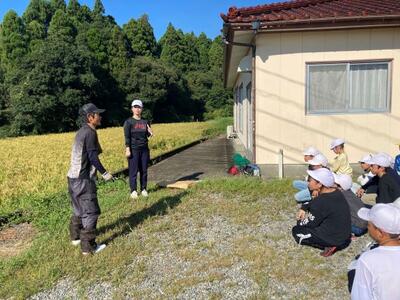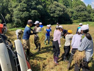 今年度は、美々津小学校の5・6年生と一緒に活動しました。20人以上と例年よりも2倍以上多い子供たちが協力して取り組んだので、たくさんの稲を刈ることができました。また、脱穀までしっかりと終えることができました。何より、美々津小学校の児童と、とてもいい交流ができました。