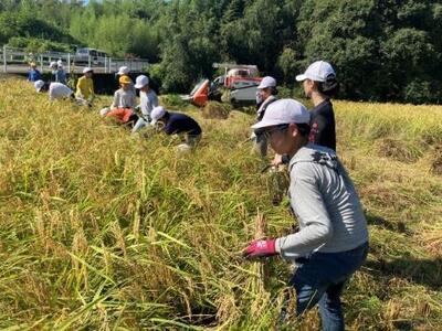 例年は、10月の中旬に実施しているのですが、今年度は晴天の日が多く、思ったよりも早く実りました。炎天下での稲刈りになったので、熱中症に十分気を付けながら実施しました。