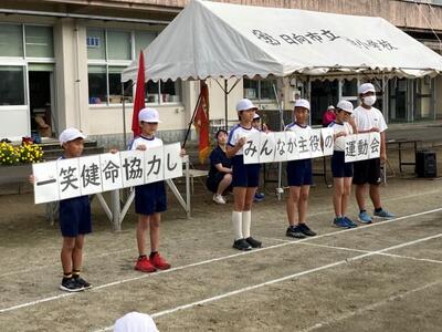 まずは結団式です。はじめに、運動会のスローガンの発表です。今年度は「一笑懸命協力し、みんなが主役の運動会」に決まりました。