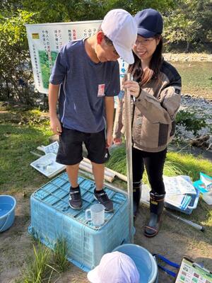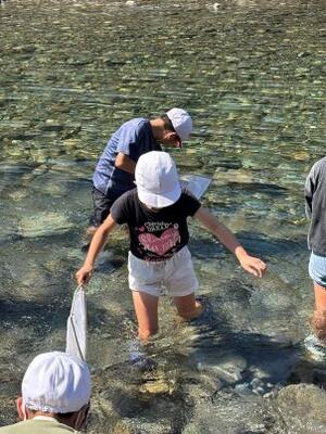 石並川の岸辺で、音、風景、においなどを調査し、最後に水生生物の調査を行いました。水の中に入り、魚やエビなど、様々な水生生物を採取しました。調査の結果、石並川は「きれいな川」であることが分かりました。いつまでも「きれいな川」であり続けるためにも、自然を大切にしていきたいですね。