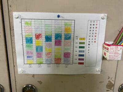 2学期の学期目標は「体をきたえよう」「生活のリズムを整えよう」の2つです。結果は写真の通り。満点の日が2日もあるなど、高得点でした。本当によく頑張っていますね。