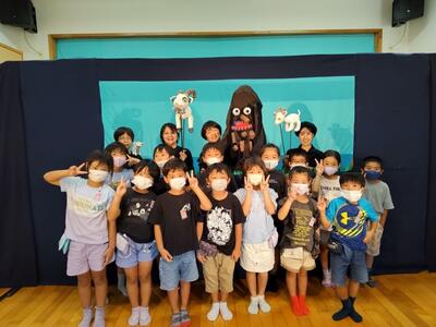 9月9日(火)、1・2年生は高松保育園に人形劇を見に行きました。延岡市の「風と土の学校」から「人形劇団土の子」の皆さんによる「3びきのやぎのがらがらどん」という劇を鑑賞しました。保育園のお子さんと一緒に楽しみながら鑑賞しました。人形劇の後には、実際の人形にも触らせてもらいました。