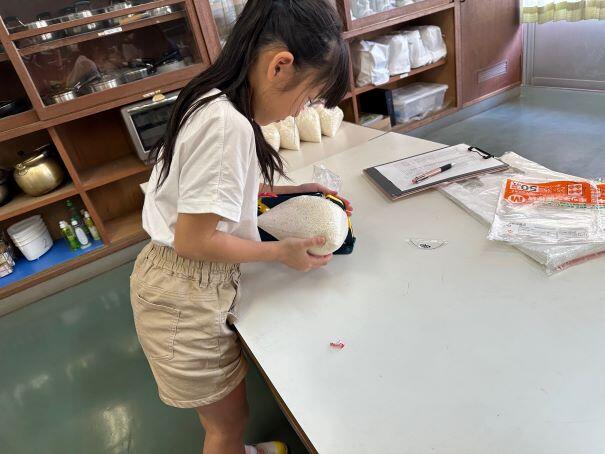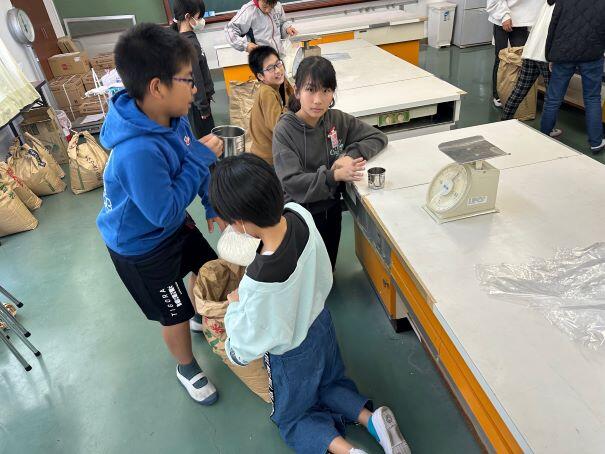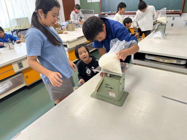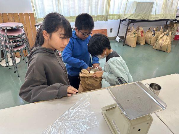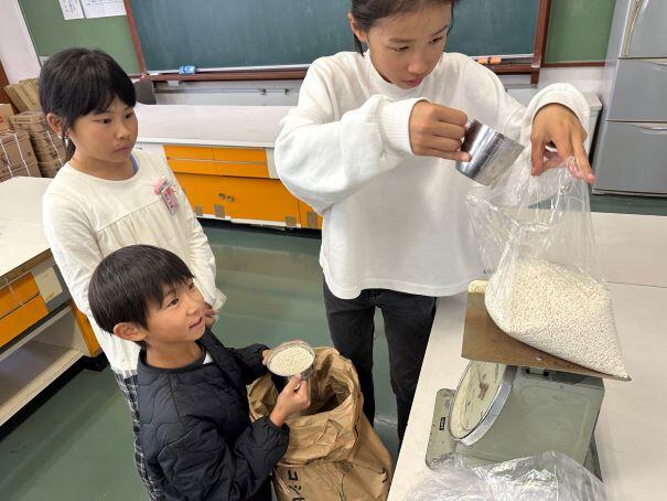 5年生は、精米したもち米を1升(1.5kg)ずつに計量し、袋詰めしています。袋詰めされたもち米は、12月5日(金)に保護者や地域の方に販売します。