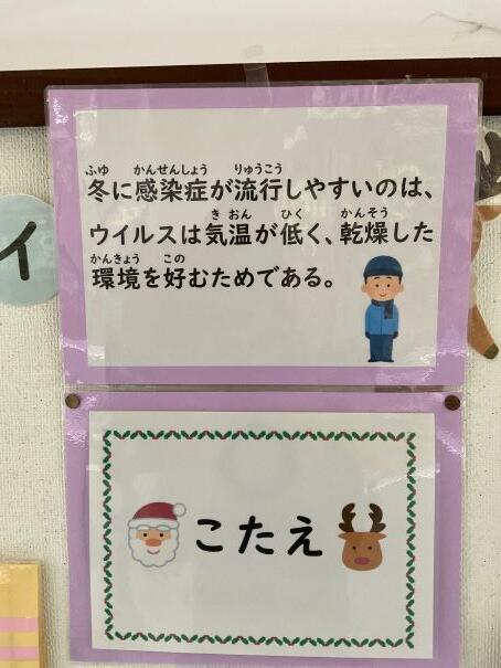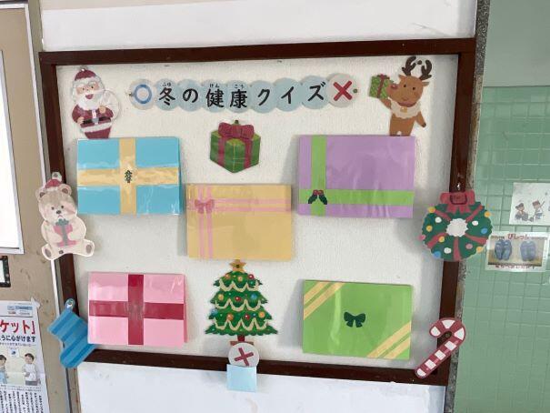 保健室前の掲示板には、体調を崩さないための豆知識がクイズ形式で掲示されています。保健室の先生が作成しました。子どもたちも楽しそうにクイズに取り組んでいます。クイズから学んだことを生活にいかし、この冬を元気に過ごしてほしいものです。