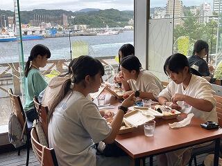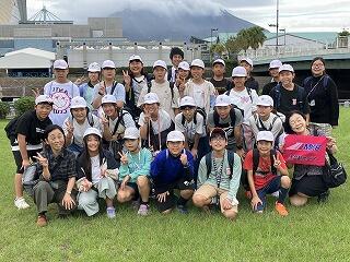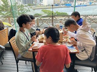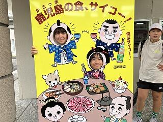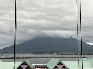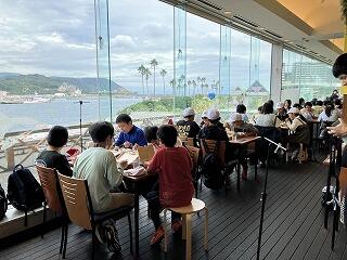 桜島をバックに記念写真を撮った後、昼食会場へ。