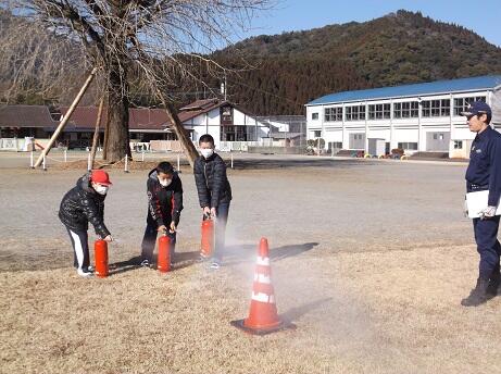 また、万が一に備え、水消火器を使っての消火訓練を行いました。