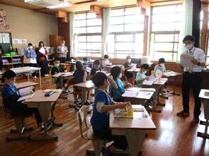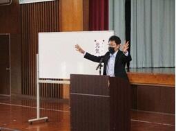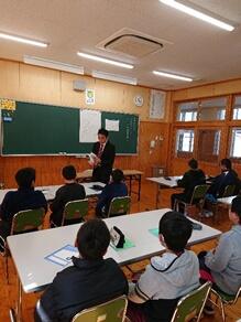 6年生のキャリア教育の取組で弁護士の牟田圭佑さんに来ていただき、弁護士の仕事について話をしてもらいました。細かな仕事や気配りなど、なかなか聞くことができない話に子どもたちも真剣に聞いていました。実際の六法全書や弁護士バッジなども見せてもらい、興味が膨らんだようでした。
