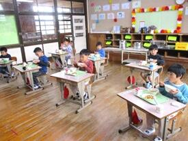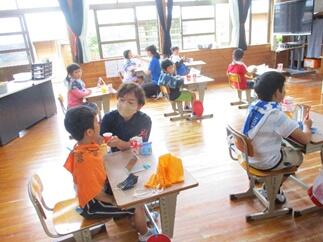 13日(月)から1年生の学校生活が本格的にスタートしました。今日は「はじめてのお勉強」「はじめての給食」「はじめての昼休み」とはじめてづくしでした。7人とも目をキラキラさえて「はじめて」の体験をがんばっていました。きちんといすに座って、返事もバッチリ!!たのもしい1年生です。