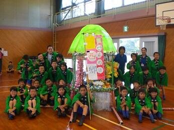 二学年で1基の神輿となり、それぞれにテーマを作り、協力して製作しました。年の神神社の神田の中で、子どもたちは揃いの法被を着て、自分たちが作った神輿を誇らしげに担いでいました。