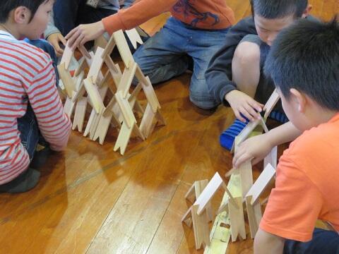 中央と右の写真は、フランスなど国際展示会に出展された積み木で遊ぶ本校の児童の様子です。