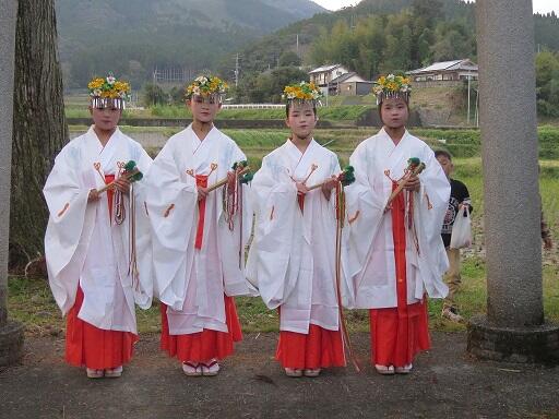 11月18日(土)に田代神社大祭が行われました。毎年、神事の後に、小学生女児4名が「浦安の舞」を舞います。今年も、学校が終わった後、約1ヵ月間、地域の方々のご指導で練習を行ってきました。お化粧をして静々と舞う姿に、参拝に来られた方々から大きな拍手が送られていました。