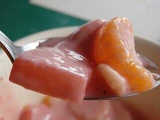 今日のズームアップはフルーツヨーグルトイチゴソースです。ご覧のとおり、みか