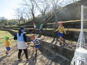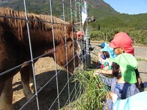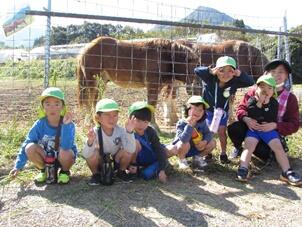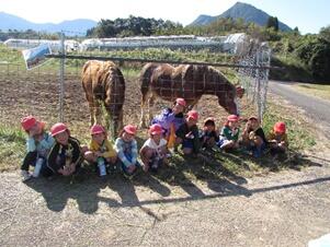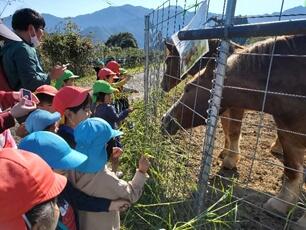 11日(水)に園児全員で上野原地区で育てられている馬を見に行きました。子供たちは近くで見る迫力があるけど、かわいい馬に大喜びで草をあげたり、近寄って触ってみたりと楽しい時間でした。ちょっと遠い散歩だったけど行き帰りも仲良く、安全に移動できました。