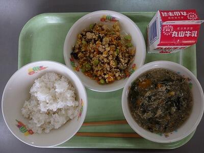 麻婆豆腐は給食の定番メニューですが、錦糸卵のごま和えは、本年度初メ