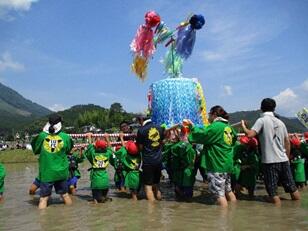 見物客の多さにびっくりしていましたが、牛馬入れの様子に歓声を上げ、神楽や太鼓を見入っていました。太もも近くまで田んぼに足を入れながら元気よく「ヨーサヤ ヨーサヤ」のかけ声で祭りを盛り上げました。素晴らしいできのみこしや子どもたちの様子に会場から大きな拍手をもらい、子どもたちも満足した1日になりました。