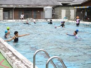 天気が良く、園児も朝からプール遊びの時間を楽しみに待っています。年長さんは今年度から小学校の低学年用プールを使って活動しています。水を怖がる子もなく、時間いっぱい楽しく活動しています。
