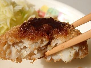 チカツの断面をズームアップ。外がサクッ、中がジューシー、かかったソースの香り