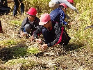 のご協力いただき稲刈り体験をしました。初めて体験する5年生は、最初ぎこちない様子で稲を刈っていましたが、後半では鎌使いも上手になりました。6年生は、昨年も体験しているだけあって、最初から慣れた手つきで稲を刈っていました。